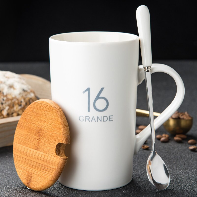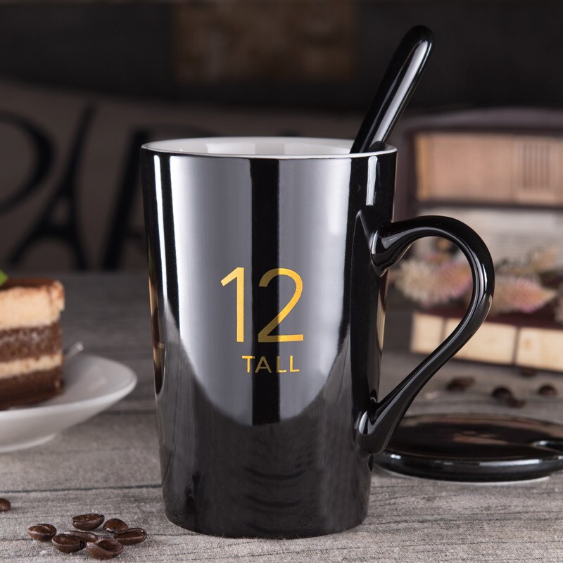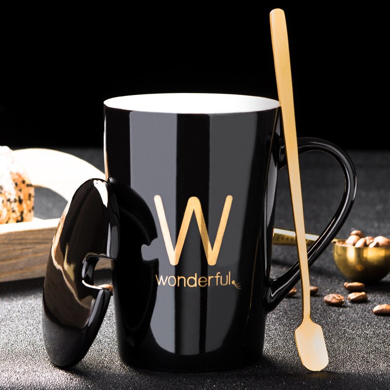 420/580ml keramiska muggar bokstavsnummer mönster muggar med sked lock svart och guld mjölk kaffekopp drinkware